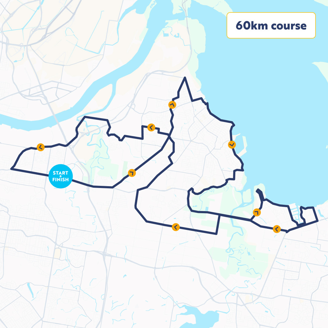 The 60km ride is a thrilling challenge, starting at the world-class Brisbane International Cycle Park and winding its way to Wynnum and back. This picturesque course is perfect for regular riders ready to push their limits and take on a more competitive edge, whether solo or with teammates. On open roads, this ride demands focus, determination, and a spirit of adventure, making it a truly rewarding experience for those ready to embrace the challenge.